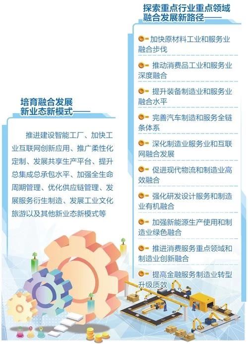 例如:在推动消费品工业和服务业深度融合方面,注重差异化、品质化、绿色化消费需求,推动消费品工业服务化升级;在提升装备制造业和服务业融合水平方面,推动装备制造企业向系统集成和整体解决方案提供商转型;在完善汽车制造和服务全链条体系方面,加快汽车由传统出行工具向智能移动空间升级……