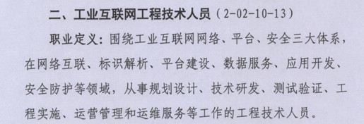 工业互联网是新出来的业态,工业互联网工程技术人员的职业定义是:围绕工业互联网网络、平台、安全三大体系,在网络互联、标识解析、平台建设、数据服务、应用开发、安全防护等领域,从事规划设计、技术开发、测试验证、工程实施、运营管理和运维服务等工作的工程技术人员。