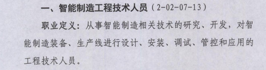 像《通告》里的智能制造工程技术人员,职业定义为:从事智能制造相关技术的研究、开发、对智能制造装备、生产线进行设计、安装、调试、管控和应用的工程技术人员。