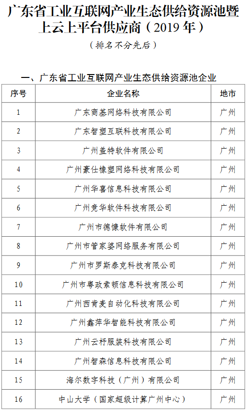 为推动制造业数字化、网络化、智能化转型升级,不断发展壮大广东工业互联网产业生态体系,根据《广东省工业和信息化厅办公室关于组织申报广东省工业互联网产业生态供给资源池暨上云上平台供应商(2019年)的通知》(粤工信办函〔2019〕30号)和《广东省工业和信息化厅关于印发广东省工业企业上云上平台服务券奖补工作方案(2019)的通知》(粤工信工业互联网函〔2019〕1553号)文件要求,我厅先后组织开展了2019年第一、二、三批广东省工业互联网产业生态供给资源池暨上云上平台供应商的申报和遴选工作。经企业申报、专家评审和网上公示,现予以公布。