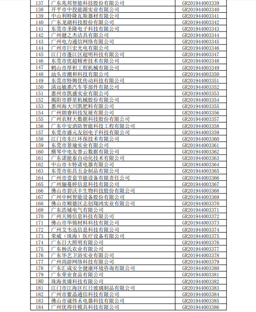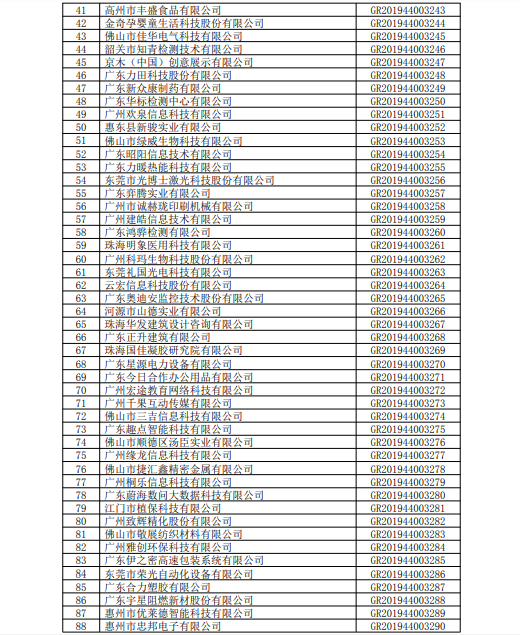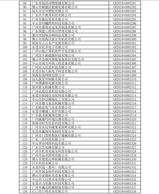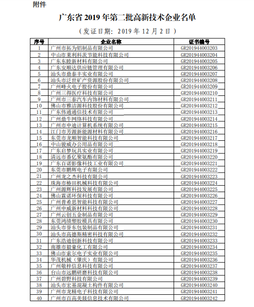 你们上报的《关于广东省2019年高新技术企业认定备案的函》(粤科函高字〔2019〕1730号)收悉。现将公示无异议的广州市拓为铝制品有限公司等4090家企业予以高新技术企业备案。请你们按照《广东省2019年第二批高新技术企业名单》(详见附件)中的企业名称、高新技术企业证书编号和发证日期打印并颁发“高新技术企业证书”。