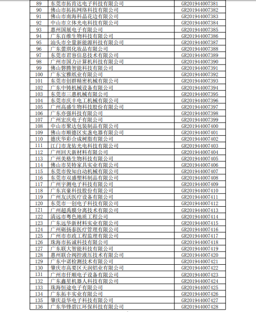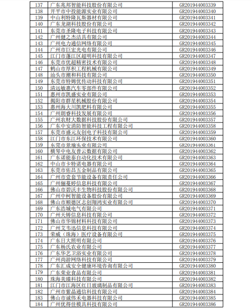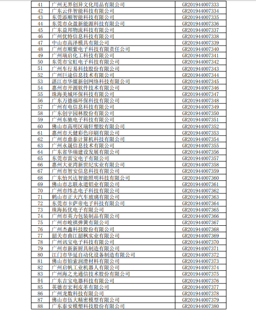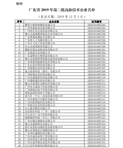 你们上报的《关于广东省2019年高新技术企业认定备案的函》(粤科函高字〔2019〕1730号)收悉。现将公示无异议的横琴小胖胖新媒体有限公司等3236家企业予以高新技术企业备案。请你们按照《广东省2019年第三批高新技术企业名单》(详见附件)中的企业名称、高新技术企业证书编号和发证日期打印并颁发“高新技术企业证书”。