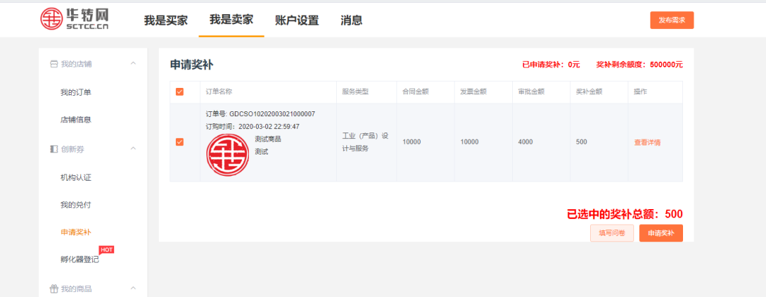 服务机构登录后,可在【用户中心】--【我是卖家】---【申请奖补】对已兑付的订单申请奖补。