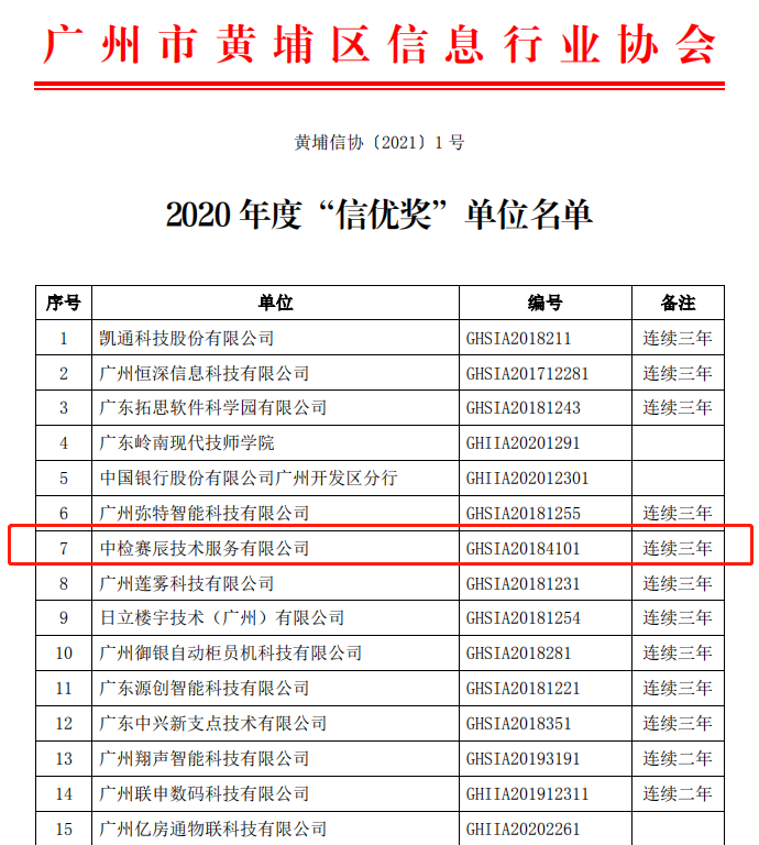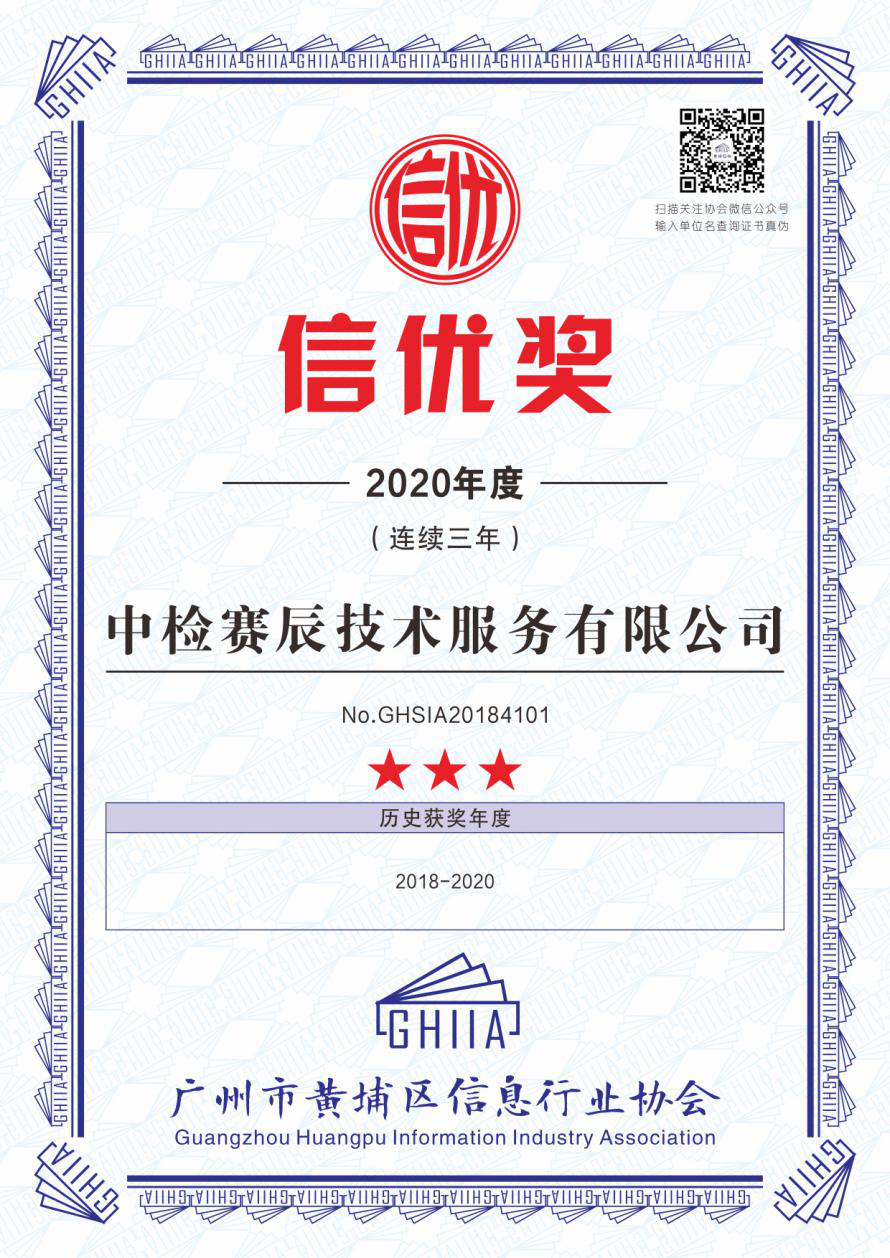 从广州市黄埔区信息行业协会获悉,中检赛辰技术服务有限公司(简称“赛辰”)荣获2020年度广州市黄埔区“信优奖”证书称号!这是赛辰自2018年起,连续三年荣获“信优奖”殊荣。