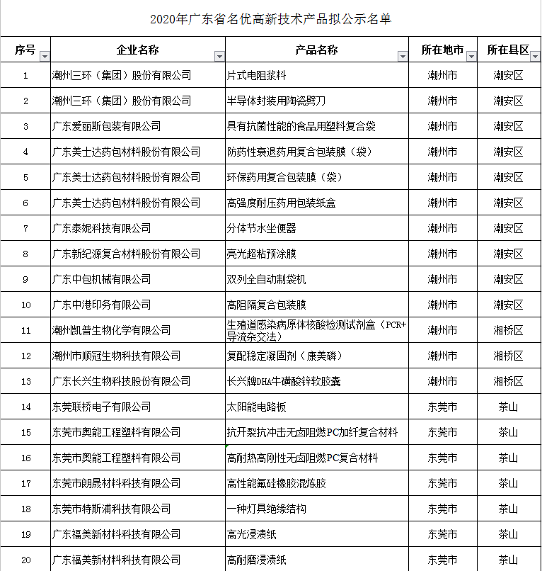 官方公示文件,全部名单点击关于2020年广东省名优高新技术产品拟通过评选名单的公示下载。