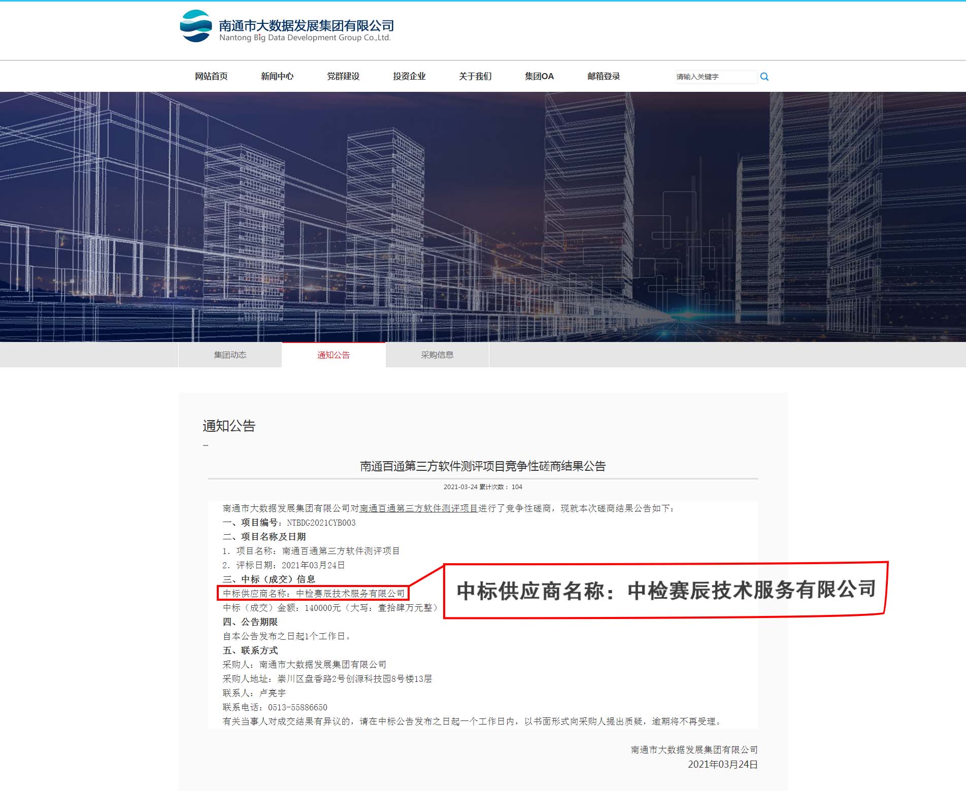 ×£ºØÖмìÈü³½¼¼Êõ·þÎñÓÐÏÞ¹«Ë¾£¨¼ò³Æ£ºÈü³½£©ÖбêÄÏͨ°ÙͨµÚÈý·½Èí¼þ²âÆÀÏîÄ¿£¬Öбê½ð¶î£º140000Ôª¡£