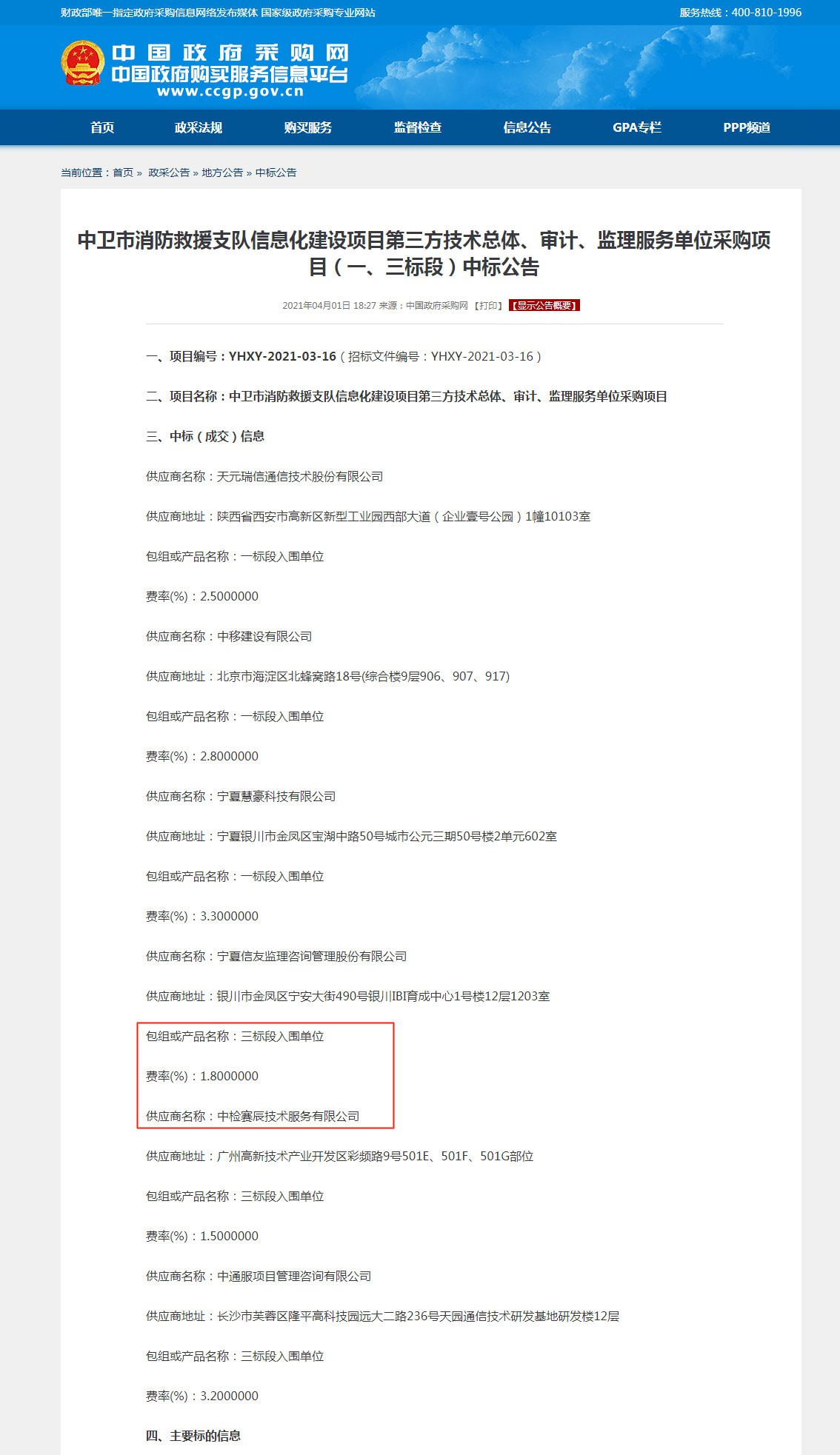 奋力开创!祝贺中检赛辰技术服务有限公司(简称:赛辰)中标中卫市消防救援支队信息化建设项目第三方技术总体、审计、监理服务单位采购项目(三标段入围单位)。